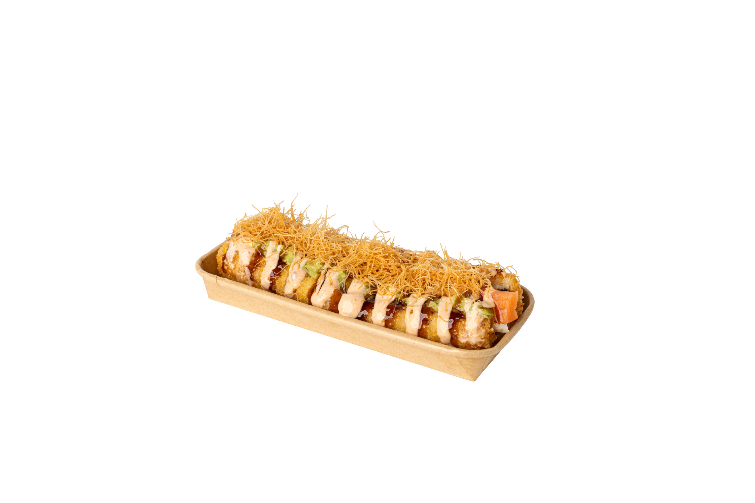 Our Japanese hot dog: crispy salmon uramaki, guacamole and cream cheese, with teriyaki and Kazan sauces, and a final touch of kadaifi noodles. A total fusion of Japanese and street food.