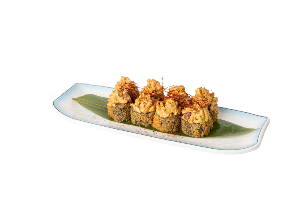 Futomaki de aguacate y queso crema, tempurizado en panko y colmado con tartar de salmón con guacamole picante, perlas de arroz y cebollino fresco