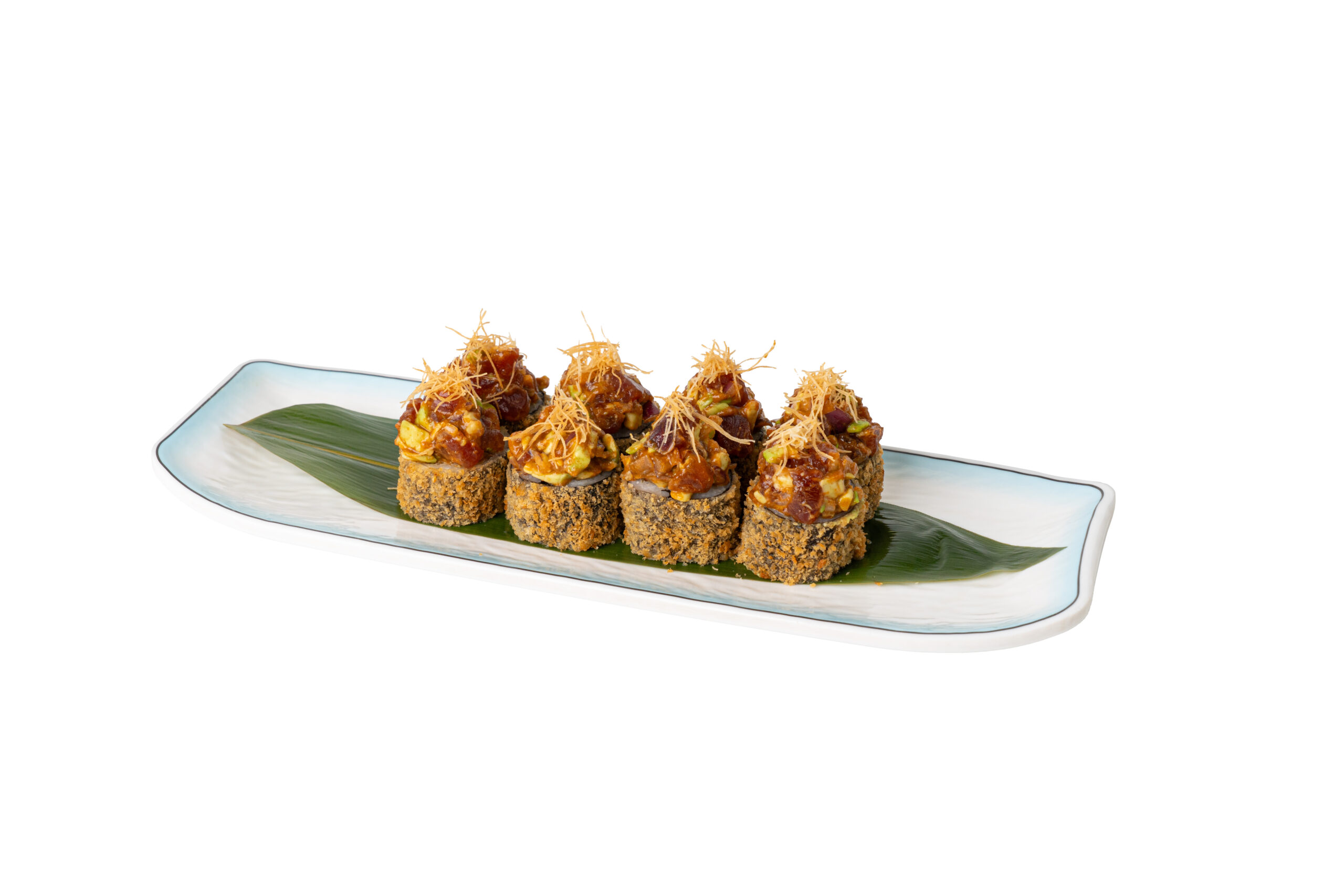 Futomaki de aguacate y queso crema, tempurizado en panko y colmado con tartar picante de atún, aguacate y cebolla morada. Terminado con fideo kadaifi.