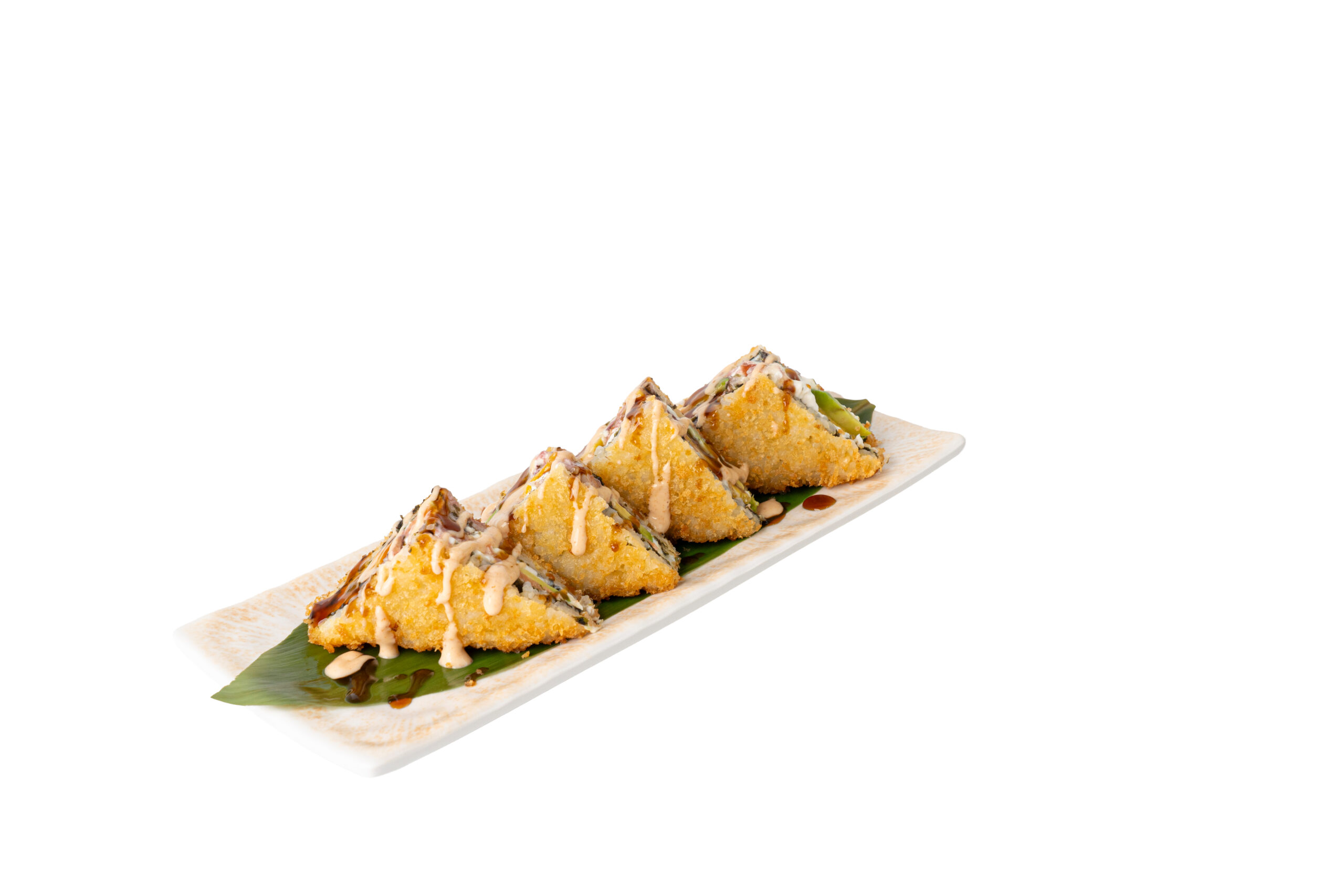 Japanese salmon sandwich with cream cheese and mango, coated in panko for a crispy touch. Finished with teriyaki sauce and accompanied by a mild caramelized onion sauce.