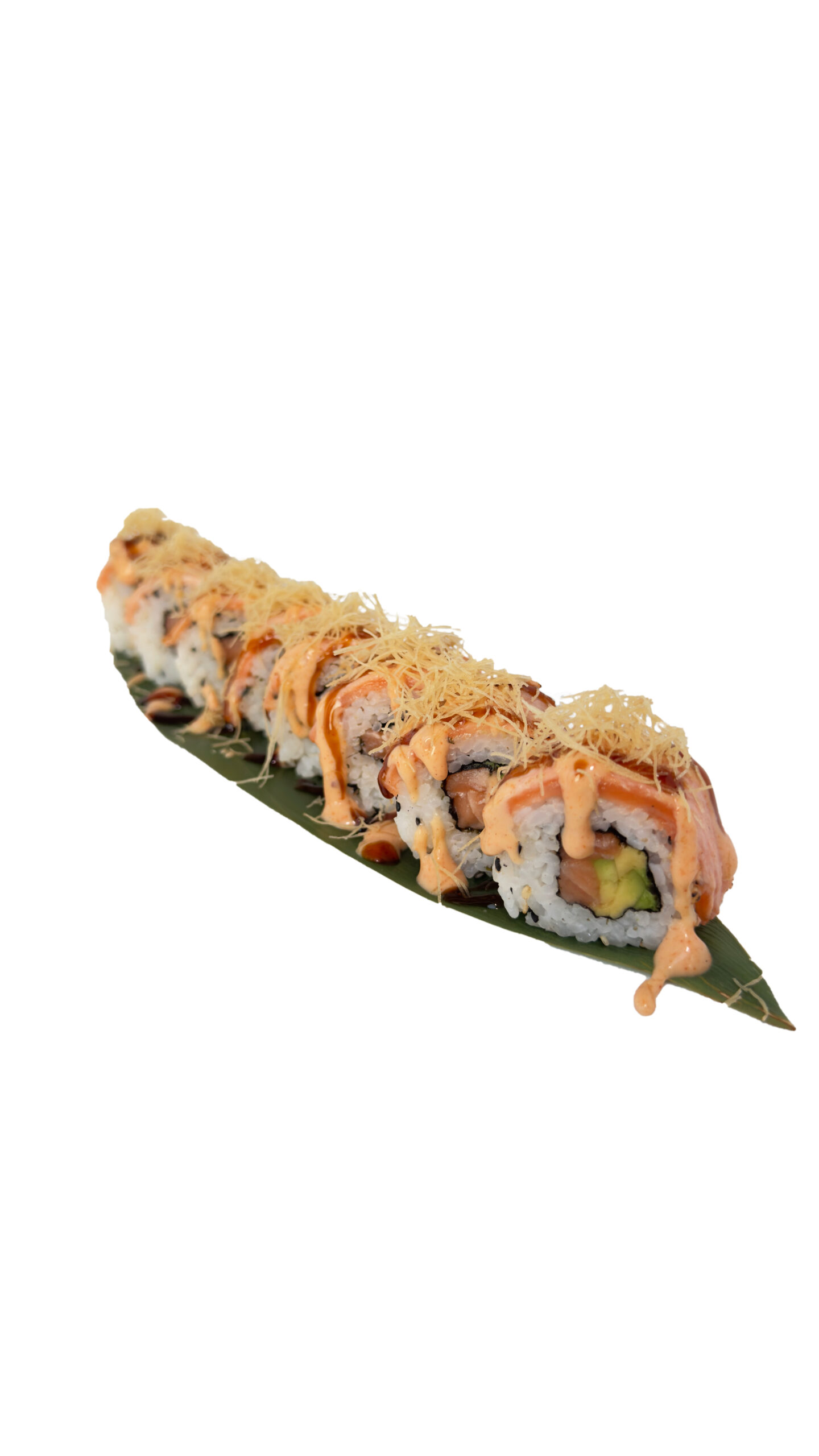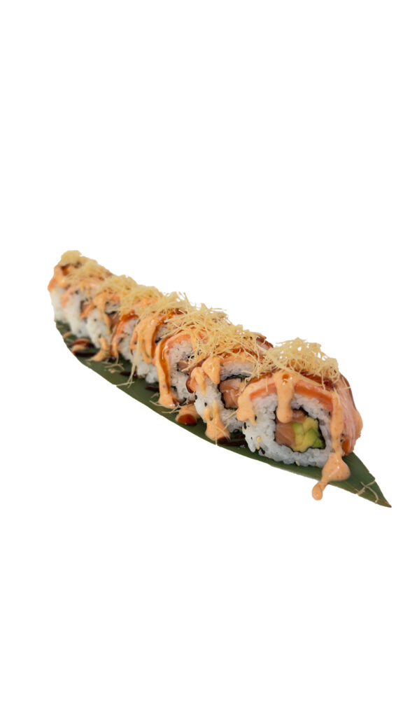Aguacate y salmón enrollado en arroz de sushi y cubierto de salmón flameado, salsa picante de miel y mostaza, salsa teriyaki y fideo kadaifi.