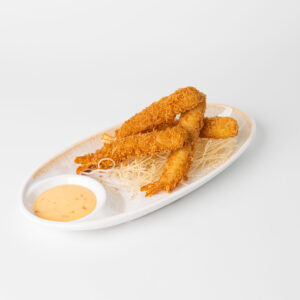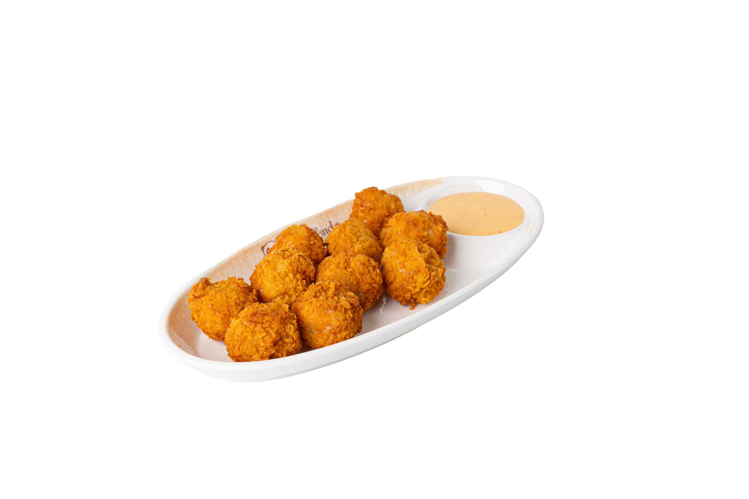 Esferas de pollo y patatas chips rebozadas y servidas con mayonesa japonesa.