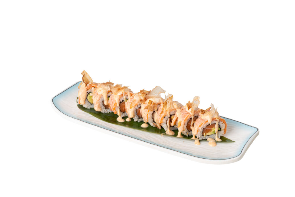 Aguacate y salmón enrollado en arroz de sushi y cubierto de salmón flameado y salsa picante de miel y mostaza.