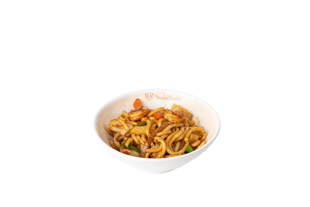 Fideos de trigo salteados con pimientos, cebolla, gambas, calamares y nuestra salsa de ostras.